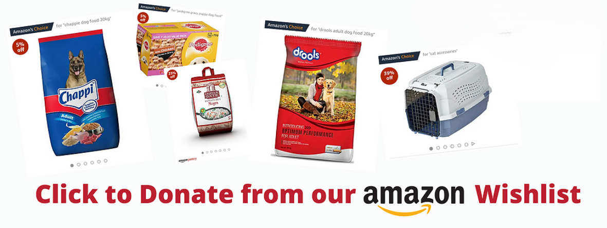 You can also donate food items for dogs and puppies under our care. Our monthly requirement is as follows: 200 kgs Rice, 100 kgs of Dog food, 60 litres Milk, dog biscuits, bread, eggs and dog treats. You can also donate beds, blankets, bed sheets or gunny bags for winters and fans for summers. We also require dog shampoos, soaps, collars, leashes, and bowls on a regular basis.